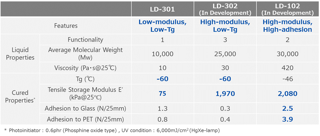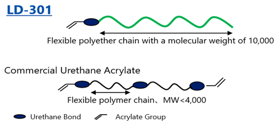 LD-301 has a unique structrure with urethane and acrylic groups only near the ends of its high molecular weight polymer chains. By incorporating LD-301, it contributes to lowering the Tg and enhancing the flexibility of the cured material.