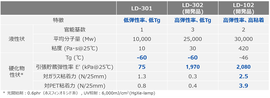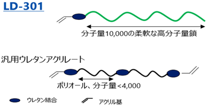 LD-301は高分子量体の末端付近にのみウレタン基、アクリル基を有する特殊な構造をしています。