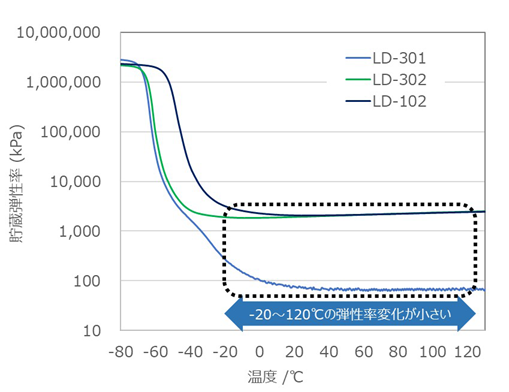 LD-302は低Tg、高モジュラスであり低温~高温まで高弾性率を維持します。
